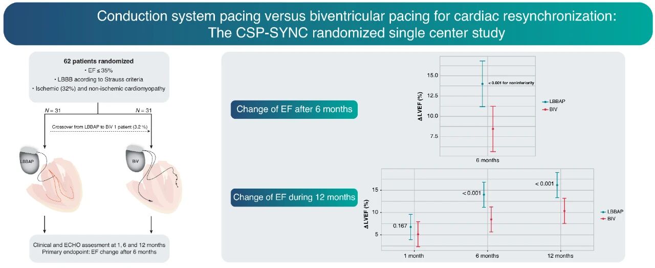 该研究得出结论,对于CRT I类适应证患者,LBBAP在改善LVEF方面不劣于BiV起搏,并能产生相似的心脏结构及电重构效果。